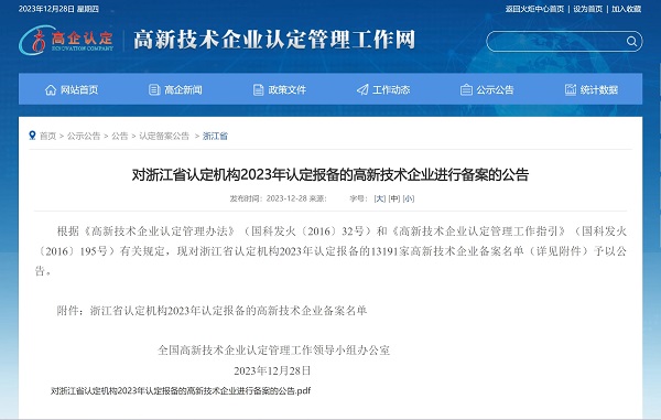 2023年12月28日,全國高新技術(shù)企業(yè)認定管理工作領(lǐng)導小組辦公室發(fā)布《對浙江省認定機構(gòu)2023年認定報備的高新技術(shù)企業(yè)進行備案的公告》,中國能源工程集團有限公司(以下簡稱“中國能源工程集團”)所屬中清能源(杭州) 有限公司...